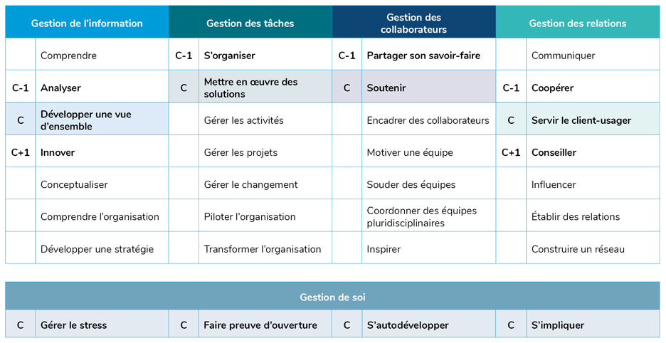 Le cinquième groupe de compétences (Gestion de soi) ne suit pas la même logique que les 4 autres groupes de compétences. 4 compétences comportementales sont proposées (C) pour ce groupe à savoir : gérer le stress, faire preuve d’ouverture, s’autodévelopper, s’impliquer.